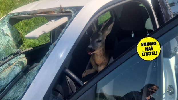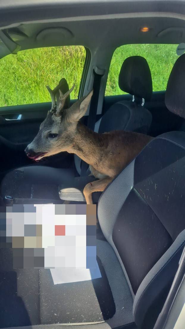U mjestu Končanica kod Daruvara vozač je naletio na srndaća. Cijeli je ušao u automobil. Životinja je završila na stražnjem sjedištu automobila. Počeo je skakati po autu, ali su ga svladali, kaže vozač