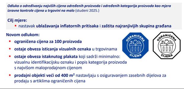 Ministar Šušnjar je kazao da se odlukom popis proširuje na 100 proizvoda. Njome je obuhvaćeno 29 proizvoda za koje su trgovci dužni ograničiti cijenu, a za ostalu 71 kategoriju proizvoda moraju osigurati najmanje jedan artikl po ograničenoj cijeni i odrediti najvišu maloprodajnu cijenu za barem jedan artikl po kategoriji, piše Telegram.