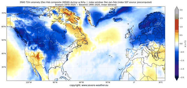 Iako su učinci La Niñe najpredvidljiviji u Sjevernoj Americi, gdje često donosi hladnije i snježnije uvjete na sjeveru, a suše na jugu, situacija u Europi je znatno složenija. Ipak, postoje određeni obrasci koji se ponavljaju.