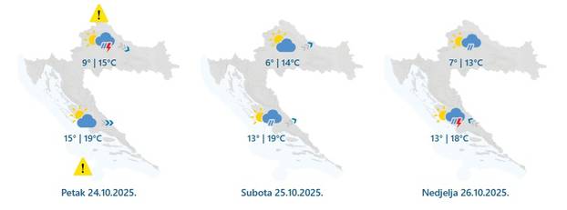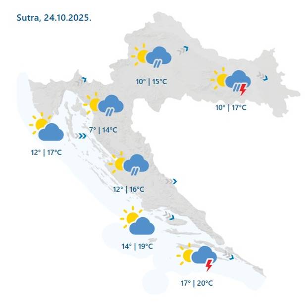 - Djelomice sunčano uz promjenljivu naoblaku. Lokalni pljuskovi najvjerojatniji su poslijepodne u sjevernim krajevima gdje mogu biti praćeni prolazno pojačanim vjetrom, a rano ujutro praćeni grmljavinom na krajnjem jugu. Umjeren do jak sjeverozapadni vjetar već ujutro u okretanju na slab do umjeren jugozapadnjak. Na Jadranu će umjeren i jak zapadnjak i sjeverozapadnjak, na udare ponegdje i olujan, postupno slabiti. Najniža temperatura zraka od 7 do 11, na Jadranu od 12 do 17. Najviša dnevna između 13 i 17, na moru od 17 do 21 °C - stoji u prognozi DHMZ-a za petak, 24. listopada.