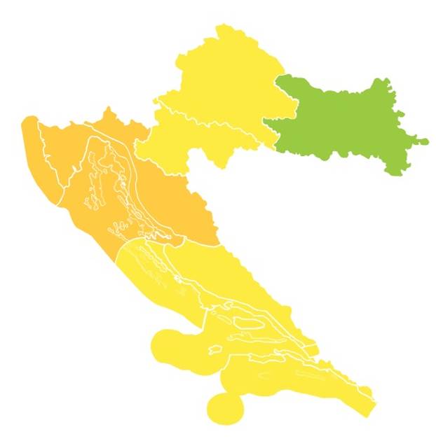 Splitska, dubrovačka i kninska regija pod žutim su upozorenjem zbog vjetra i grmljavinskih nevremena, za zagrebačku i karlovačku oglašeno je žuto upozorenje zbog vjetra. Za osječku regiju nema upozorenja.