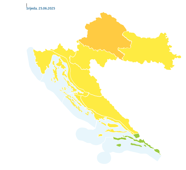 DHMZ je izdao za ponedjeljak za zagrebačku regiju žuto upozorenje zbog visokih temperatura. Za utorak su izdali isto upozorenje za zagrebačku i karlovačku regiju, a za srijedu su izdali narančasti meteoalarm za zagrebačku regiju zbog visokih temperatura te žuti za osječku, karlovačku, gospićku, kninsku, riječku i splitsku regiju.