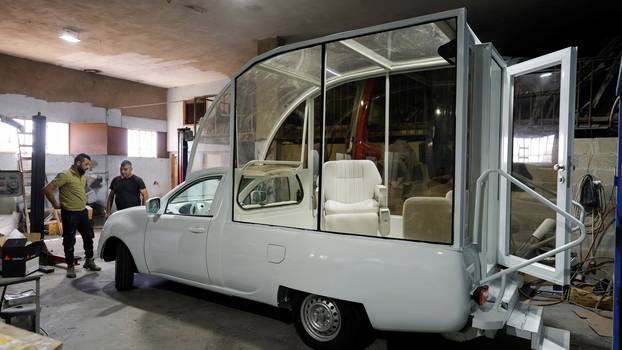 Palestinci rade na preuređenju Vozila nade, nekadašnjeg papamobila koji je papa Franjo koristio, u potpuno opremljenu mobilnu kliniku u Betlehemu, na okupiranom Zapadnom bregu Izraela