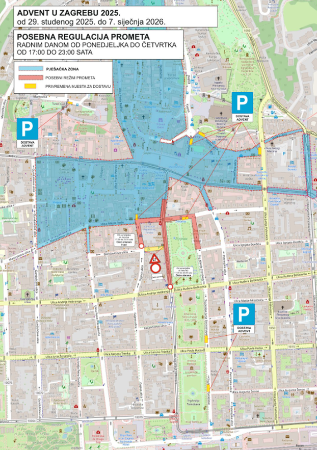 Ovogodišnja manifestacija Advent u Zagrebu, održava se od 29. studenog 2025. do 7. siječnja 2026. godine. U navedenom periodu na snazi će biti privremena regulacija prometa, odnosno privremeno zatvaranje određenih zona i ulica u središtu grada.
