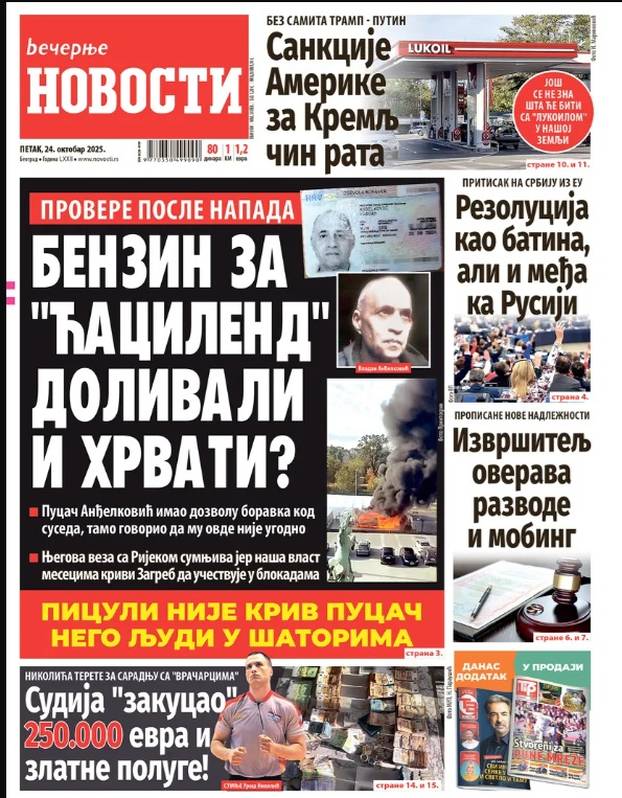 "Pucač Anđelković imao je dozvolu boravka kod susjeda i govorio da mu ovdje nije ugodno. Njegova veza s Rijekom je sumnjiva jer naša vlast mjesecima optužuje Zagreb da sudjeluje u blokadama", piše iduće budalasto Vučićevo glasilo uz naslov "Benzin za ćacilend dolijevali i Hrvati?"