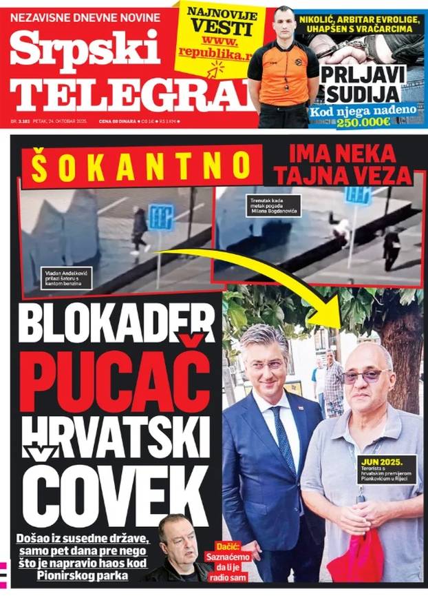 "Dorćolski blokader, koji je jučer ispred Skupštine Srbije pokušao ubiti nevinog čovjeka i zapalio šator, uslikan je u lipnju ove godine s hrvatskim premijerom Andrejem Plenkovićem na teritoriji Republike Hrvatske. Slučajnost ili ne?", mrtvo hladno piše Kurir, koji očito smatra da postoji šansa da ga je Plenković pri ovom susretu 'radikalizirao' ili mu dao neki tajni zadatak. Tko će znati što je u glavama novinara režimskih srpskih medija, vjerojatno propuh, kasnije spominju i 'operaciju'.