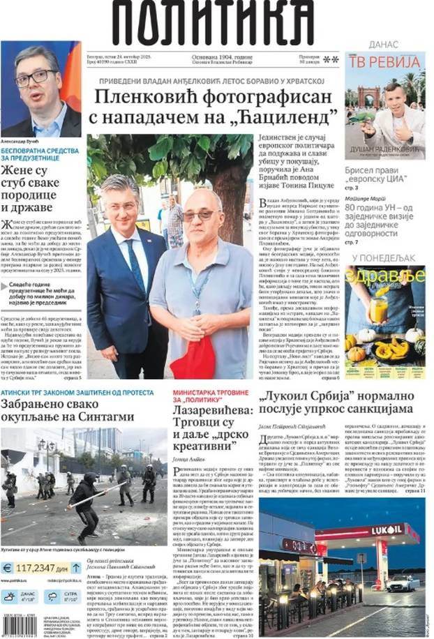 "Plenković fotografiran s napadačem na Ćacilend", stoji na naslovnici Politike.
