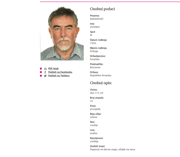 Kako javlja policija, traga se za Zvonkom Radanovićem (69) iz Brestovca. On se 29. listopada 2025. udaljio s adrese prebivališta u nepoznatom smjeru i od tada mu se gubi svaki trag, priopćila je požeško-slavonska policija.