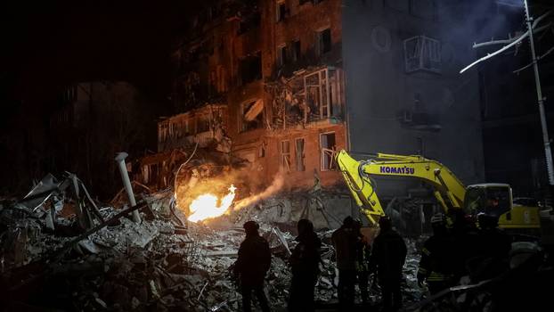 Ruske balističke rakete pogodile su stambenu zgradu u središtu grada. Spasioci pretražuju ruševine u potrazi za zatrpanima