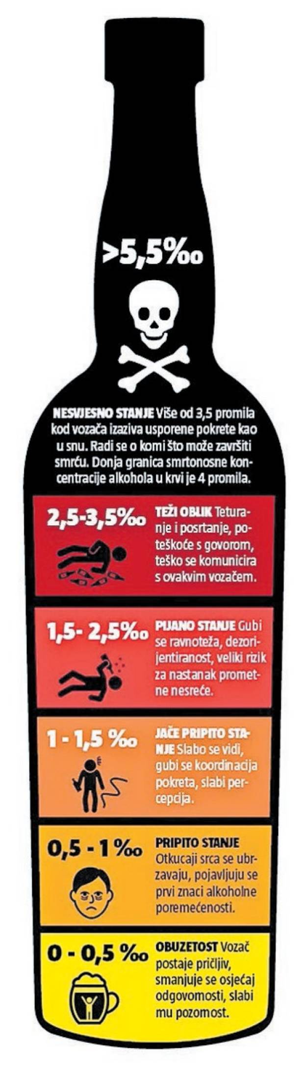 1 do 1,25 promila – nastupaju značajne smetnje motorne koordinacije i sposobnosti pravilne procjene, moguće su poteškoće u govoru, ravnoteži, vidu, vremenu reakcije i sluhu.