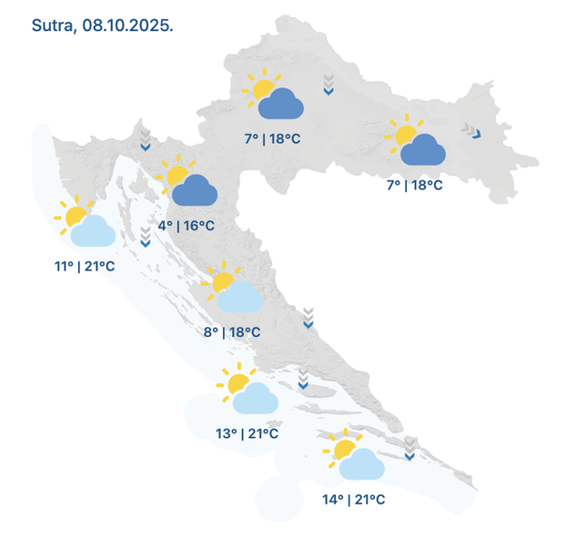 U srijedu nas očekuje pretežno, a u unutrašnjosti djelomice sunčano vrijeme. Mjestimice će biti i više oblaka, no uglavnom će ostati suho. U jutarnjim satima lokalno je moguća kratkotrajna magla, osobito u nizinama i uz rijeke.