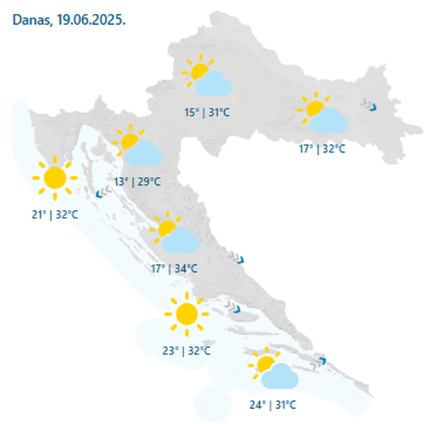 - Vjetar uglavnom slab, mjestimice do umjeren sjeverozapadni. Navečer i u noći na petak umjeren, lokalno do jak sjeverni i sjeveroistočni. Na Jadranu ujutro slaba do umjerena bura, zatim sjeverozapadni i zapadni, uz obalu i jugozapadni vjetar. Najviša dnevna temperatura većinom između 29 i 34 °C - navode iz DHMZ-a.