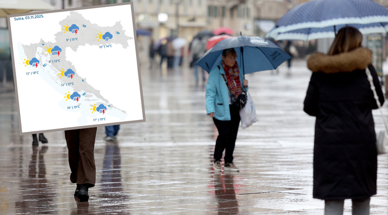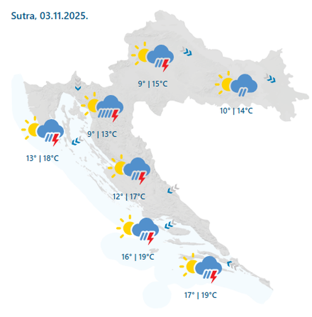 - U središnjoj Hrvatskoj do sredine dana povremeno kiša, u noći i ujutro ponegdje izraženija, moguće i uz grmljavinu, a zatim razvedravanje sa sjeverozapada. U početku umjeren i jak sjeverozapadni i sjeverni vetar, prijepodne će oslabjeti. Ujutro temperatura od 8 do 10 °C, danju do 15 °C, a navečer još svježije, mjestimice i magla.