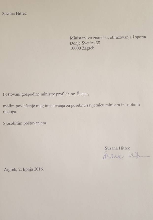 Iako je Šustar u četvrtak ujutro objavio da će mu Hitrec postati savjetnica, ona je to svojim dopisom odbila samo nekoliko sati kasnije.