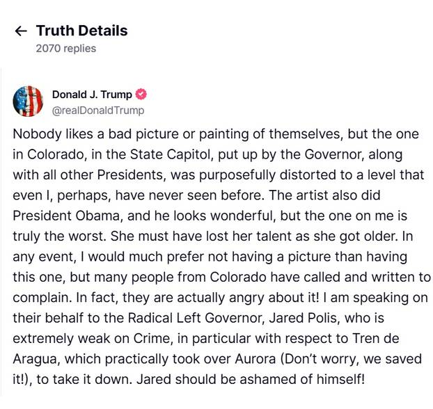 Donald Trump se na Truth Socialu požalio da nije zadovoljan službenim portretom koji je obješen na zidu u Senatu države Colorado. Smatra da Obamin portret koji se nalazi odmah do njega izgleda bolje, a da njegov izgleda iskrivljeno. Zatražio je da se portret odmah makne i optužio je slikaricu koja je napravila portrete Sarah Boardman da je izgubila vještinu s godinama.