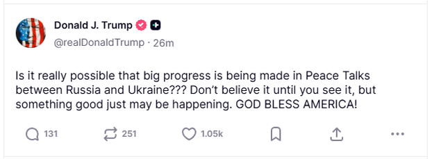 U kratkoj poruci na svojoj platformi Truth Social, američki predsjednik je napisao: „Je li zaista moguće da se postiže veliki napredak u mirovnim pregovorima između Rusije i Ukrajine???"