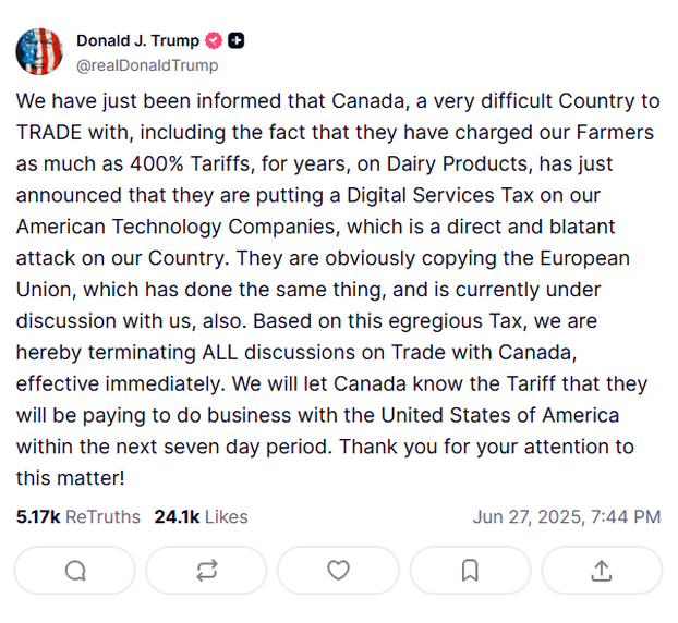 Američki predsjednik Donald Trump prekinuo je trgovinske pregovore s Kanadom te najavio da će uskoro objaviti novu carinsku stopu koju će zemlja morati plaćati, objavio je na svojoj društvenoj mreži Truth Socialu.