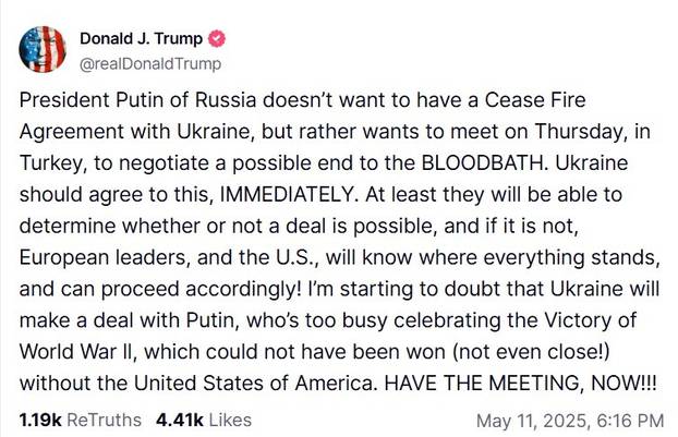- Predsjednik Putin iz Rusije ne želi sklopiti sporazum o prekidu vatre s Ukrajinom, već se želi sastati u četvrtak u Turskoj kako bi pregovarali o mogućem okončanju KRVOPROLIĆA. Ukrajina bi na to trebala PRISTATI ODMAH. Barem će moći utvrditi je li dogovor moguć, a ako nije, europski čelnici i SAD će znati na čemu su i moći će dalje postupati u skladu s tim! Počinjem sumnjati da će Ukrajina postići dogovor s Putinom, koji je previše zauzet slavljem Dana pobjede u Drugom svjetskom ratu – rata koji ne bi bio dobiven (ni približno!) bez Sjedinjenih Američkih Država. ODRŽITE TAJ SASTANAK, ODMAH - napisao je Trump u objavi koja će sigurno izazvati bijes u Moskvi koja cijelu modernu povijest Rusije gradi nad pobjedom u 'Velikom domovinskom ratu' u kojem je prema nekim procjenama poginulo između osam i deset milijuna Rusa i u kojem je uništeno 80 posto njemačke vojske.