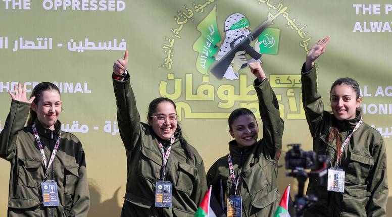 Tijekom ceremonije, Liri, Karina Ariev, Naama Levy i Daniella Gilboa smiješe se i mašu velikom mnoštvu Hamasovih operativaca i pristaša okupljenih na Palestinskom trgu u Gazi.
