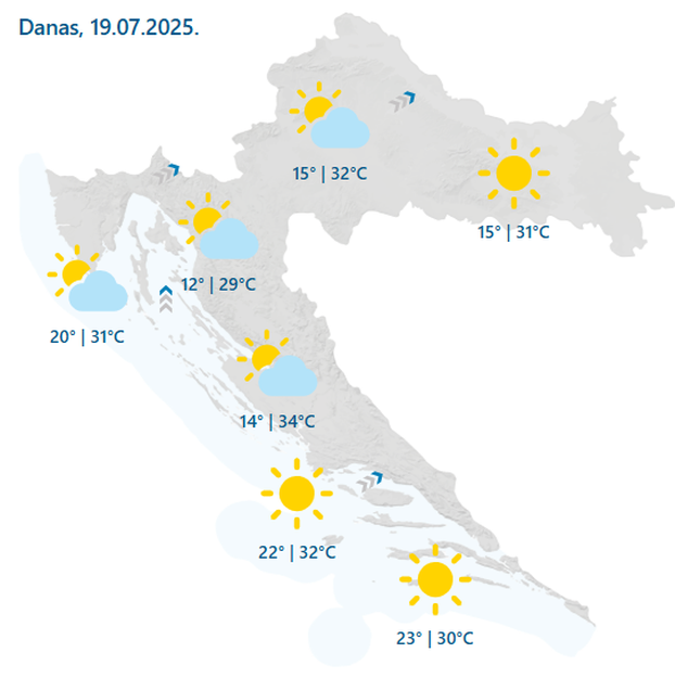 Vjetar će puhati slab do umjeren jugozapadni, na Jadranu i južni te jugoistočni. OVDJE možete pratiti prognozu po gradovima.