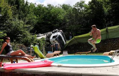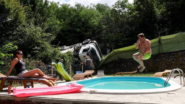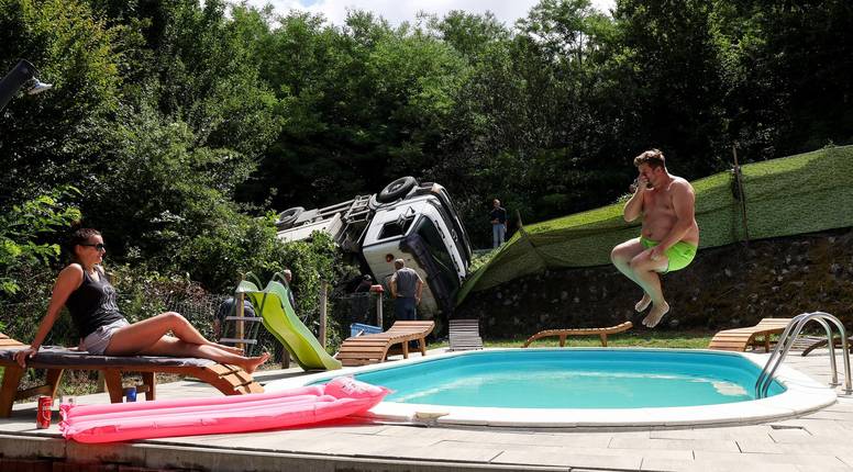 JASTREBARSKO Ništa nam neće ovaj odmor pokvarit, kažu veseli Poljaci koji su unajmili kuću za odmor u Jastrebarskom. Kažu kako su taman doručkovali kad su čuli prasak. Kamion je gotovo završio u bazenu! Zvali su vlasnika, a on je rekao kako je to već treći put da mu je netko završio u dvorištu i da u tom zavoju nisu stavili ogradu