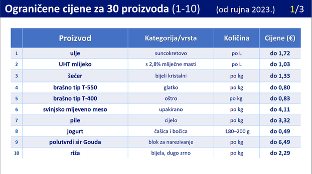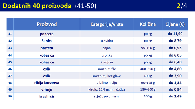 Uz ostalo, dodaju se polubijeli pšenični kruh, palenta, ječmena kaša, pahuljice, dvopek, tjestenina, suhomesnati proizvodi, konzervirani proizvodi, ribe, kao i dodatni mliječni proizvodi i voćni pekmez. Svi će ti proizvodi, koji mogu biti na policama, biti stavljeni na jednu policu kako bi se kupci lakše snašli. Velike trgovine su dužne imati i naznačen popis proizvoda koji spadaju u ovu kategoriju. Trgovci će imati sedam dana prilagodbe te bi odluka sljedeći petak trebala stupiti na snagu. Tu je i Zakon, pušten u javno savjetovanje, kojim se propisuju stroži nadzor i kazne za trgovce koji će pokušavati izbjegavati obvezu prodaje artikala s ograničenim cijenama.