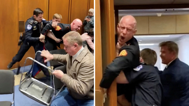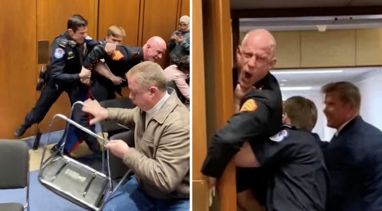 U tom je trenutku sa svog mjesta ustao senator iz Montane Tim Sheehy, član pododbora, te pritrčao u pomoć policajcima. Na videosnimkama koje su se proširile internetom vidi se kako Sheehy agresivno pokušava odvojiti McGinnisovu ruku od vrata i podiže mu nogu kako bi ga policajci lakše svladali. Ostali prisutni u prostoriji počeli su panično vikati: "Njegova ruka, njegova ruka! O, Bože! Slomio mu je ruku!", optužujući senatora da je ozlijedio prosvjednika. Nakon što su ga konačno uspjeli izvući, McGinnis je rekao kako mu ruka nije dobro i da misli da je slomljena.