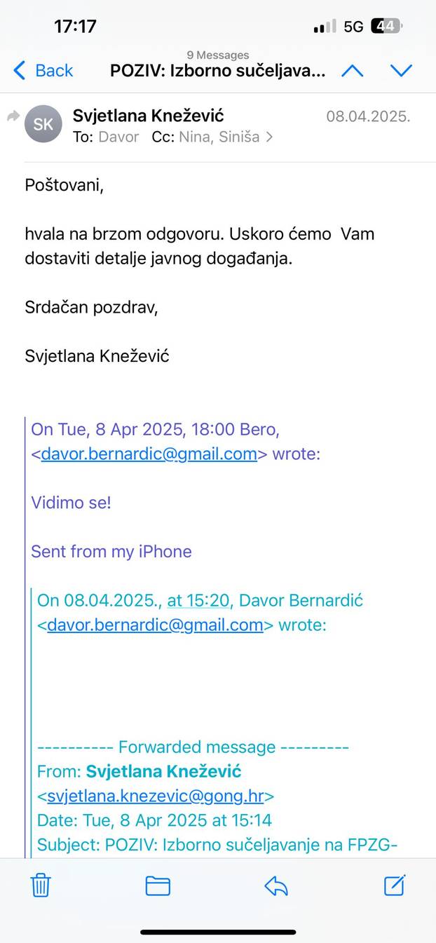"Kandidat za gradonačelnika Zagreba saveza Zagreb United Davor Bernardić došao je na sučeljavanje kandidata za gradonačelnika u 10 sati na Fakultet političkih znanosti u organizaciji GONG-a na koje je službeno pozvan mailom 8. travnja u 15:14. Poziv je potpisala Svjetlana Knežević, GONG. Kandidat za gradonačelnika Davor Bernardić potvrdio je sudjelovanje mailom istoga dana u 18:00, te dobio dodatnu potvrdu sudjelovanja istog dana od strane Svjetlane Knežević u 19:39.