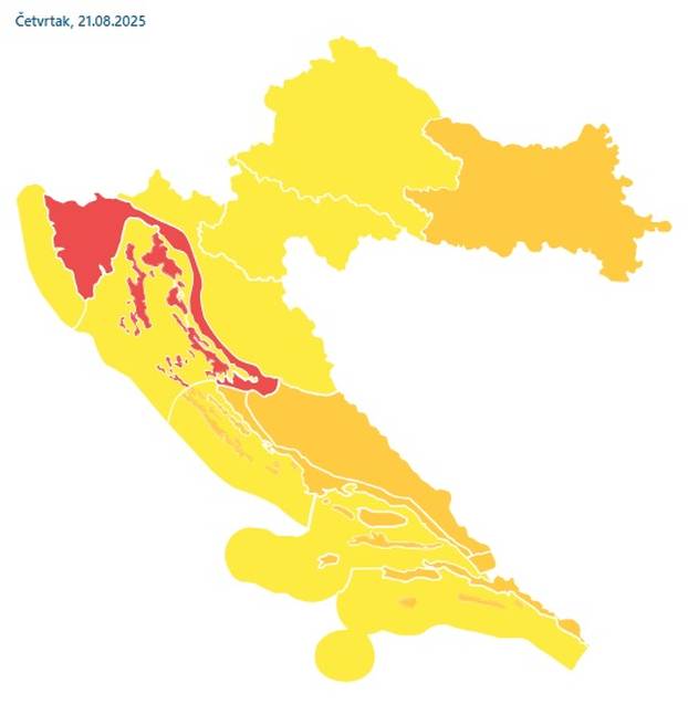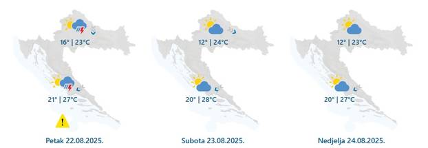 - Promjenljivo oblačno i nestabilno uz kišu i lokalno izražene pljuskove s grmljavinom. Na Jadranu ponegdje grmljavinsko nevrijeme uz naglu promjenu smjera vjetra i obilnu oborinu, u prvom dijelu dana na sjevernom dijelu, a od sredine dana u Dalmaciji. Vjetar u unutrašnjosti mjestimice umjeren južni i jugozapadni, na Jadranu jako do olujno jugo. Najniža jutarnja temperatura zraka od 15 do 20, na Jadranu od 20 do 25 °C. Najviša dnevna između 23 i 28 °C, na istoku i u Dalmaciji od 29 do 33 °C - stoji u prognozi DHMZ-a za četvrtak, 21. kolovoza.