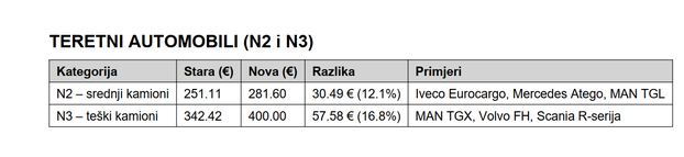 Laki teretni automobili plaćat će u prosjeku oko 28 posto višu naknadu, a u četiri kategorije će nove cijene biti od 80,40 do 237 eura. Kamioni i teški kamioni će plaćati od 12 do 17 posto više, a autobusi od 12 do 19 posto više. Mopedi i dalje neće plaćati naknadu, ali ona raste s 10 na 18 eura godišnje za motocikle.