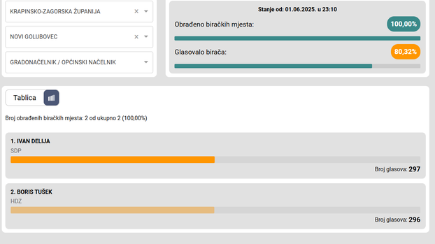 U Novom Golubovcu, birači su odlučili dati povjerenje Ivanu Deliji iz SDP-a, koji dolazi na čelo općine umjesto dugogodišnjeg načelnika iz redova HDZ-a, također za jedan glas. Ne pamti se kada je neka izborna utrka bila ovako tijesna – Valentina Presečki pobijedila je Željka Vučilovskog (HDZ, DP) s rezultatom 559:558.