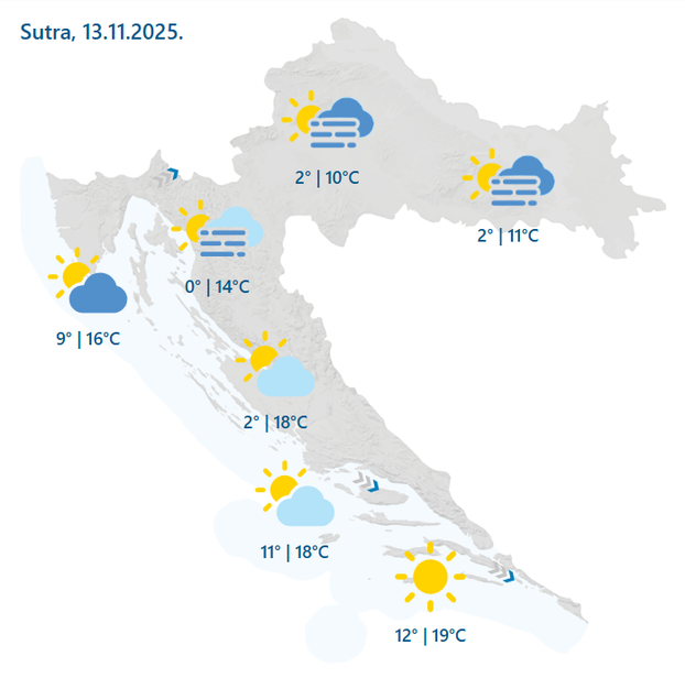 U četvrtak će većina Jadrana i gorskih krajeva uživati u sunčanom vremenu, dok će mnoge nizine biti pod maglom i sivim oblacima. Malo kiše moguće je tek mjestimice na sjevernom Jadranu, uglavnom oko Rijeke, javlja DHMZ.