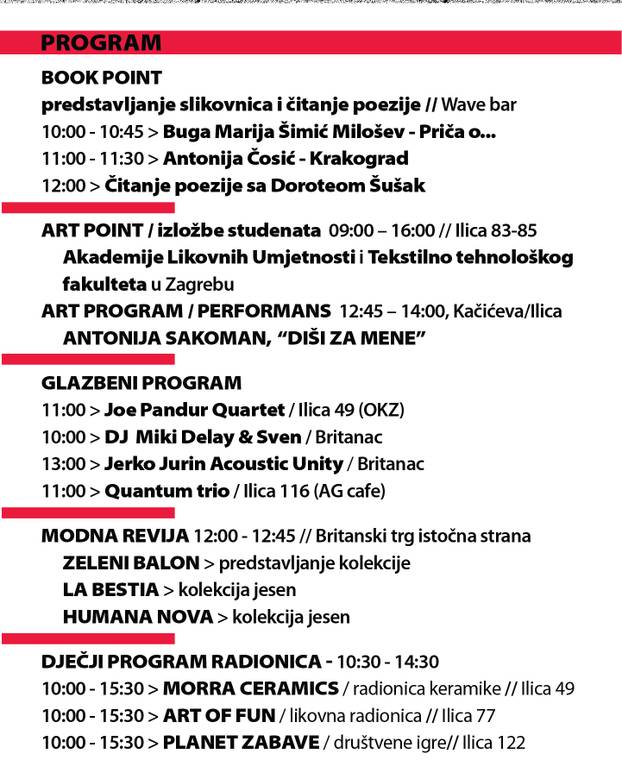 Ilica će toga dana postati prostor razmjene ideja i emocija, mjesto gdje knjige izlaze iz knjižnica, glazba iz koncertnih dvorana, a umjetnost iz galerija – i sve se to spaja na ulici.
