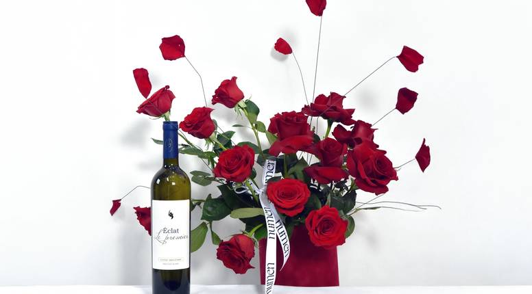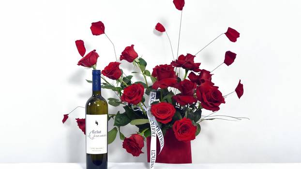 Najluksuzniji i najsnažniji paket iz kolekcije. Petnaest XXL ruža s mašnom upareno je s Éclat Plavcem Malim, dobitnikom zlatne medalje na ocjenjivačkom natjecanju Decanter. Ovo moćno vino, nastalo od autohtone dalmatinske sorte s Pelješca, osvaja dubinom boje, intenzivnim mirisima i bogatim, dugotrajnim okusom. Poklon za velike geste i nezaboravne trenutke.