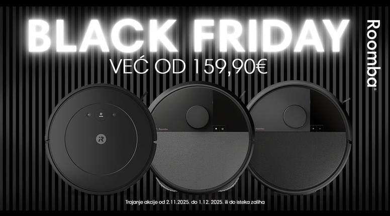 Zakoračite u Black Friday i podarite svom domu tretman kakav zaslužuje uz iRobot – jer besprijekorna čistoća sada je na dohvat ruke, dostupnija više nego ikad prije, ekskluzivno tijekom studenog. Sada možete pronaći Roomba Combo Essential Black po cijeni od 159,90 € (279,90 €), Roomba 105 Combo White po cijeni od 189,90 € (299,90 €), Roomba 105 Combo + Baza AutoEmpty White po cijeni od 299,90 € (399,90 €), Roomba 205 Dustcompactor Combo Robot White po cijeni od 319,90 € (449,90 €), Roomba Plus 405 Combo + Baza AutoWash White po cijeni od 489,90 €* (699,90 €), Roomba Plus 505 Combo + Baza AutoWash Black po cijeni od 579,90 € (799,90 €), Roomba Max 705 Combo Robot + Baza AutoWash White po cijeni od 839,90 € (1.099,90 €), Roomba Max 705 Vac robot + Baza AutoEmpty Black po cijeni od 479,90 € (699,90 €).