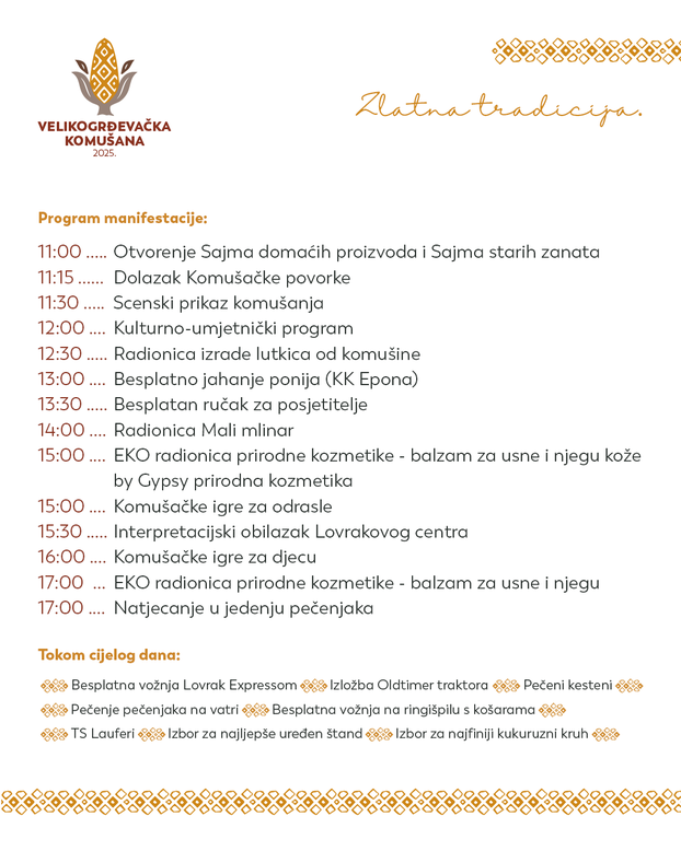 U srcu jeseni, Veliki Grđevac će 11. 10. 2025. godine, ponovno oživjeti duh tradicije kroz manifestaciju Velikogrđevačka Komušana, koja se ove godine održava pod motom Zlatna tradicija. U subotu, posjetitelje očekuje bogat cjelodnevni program: od svečanog otvorenja sajma domaćih proizvoda i starinskih zanata, preko dolaska povorke i scenskog prikaza komušanja, do kulturno-umjetničkih nastupa, radionica, dječjih aktivnosti, jahanja ponija i besplatnog ručka te interpretacijski obilazak Lovrakovog centra.