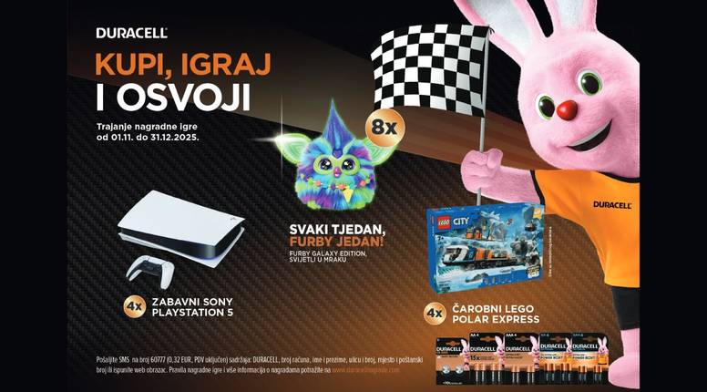 Kupite omiljene Duracell baterije na bilo kojem prodajnom mjestu u Hrvatskoj i sudjelujte u velikoj nagradnoj igri. Svaki tjedan izvlače se dobitnici bogatog nagradnog fonda – zabavnog Furbya u svjetlećem izdanju, čarobnog Lego Polar Express seta i uvijek aktualne igraće konzole PlayStation 5. Vrijeme je za energiju, a Duracell je u tome najbolji partner!