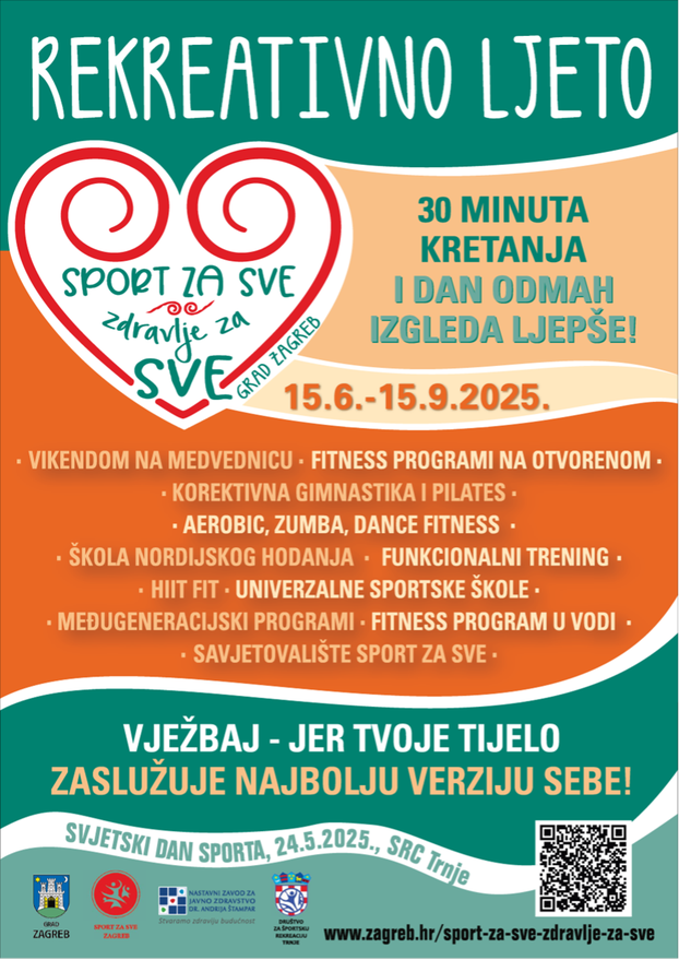 Od 15. lipnja do 15. rujna 2025. Grad Zagreb sa Zagrebačkim savezom sportske rekreacije „Sport za sve“ nastavlja s važnim projektom za zdravlje svih građana – programom Rekreativno ljeto. Riječ je o nizu besplatnih sportskih i rekreativnih aktivnosti na otvorenom koje će se održavati na više od 50 lokacija diljem grada.