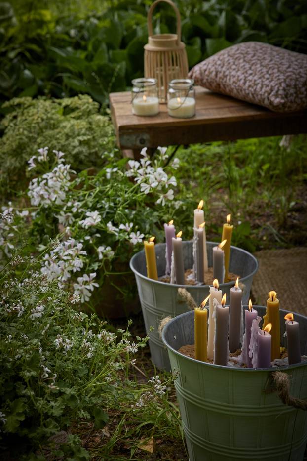 Među šarenim pelargonijama i obiljem zelenila, vrtna klupa savršena je za maštanje i razgovor. Svijeće u kantama s pijeskom daju blago osvjetljenje. Fenjeri, lampice i makrame košare za pelargonije, obješeni na granama stabala, stvaraju čarobnu atmosferu.