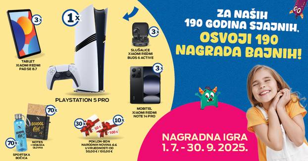 Narodne novine ove godine obilježavaju 190 godina tradicije te dijele 190 nagrada svojim kupcima školskog pribora. Kupovinom školskog pribora možete sudjelovati u nagradnoj igri i osvojiti Playstation 5 PRO, tablete, mobitele ili neku drugu od 190 nagrada.