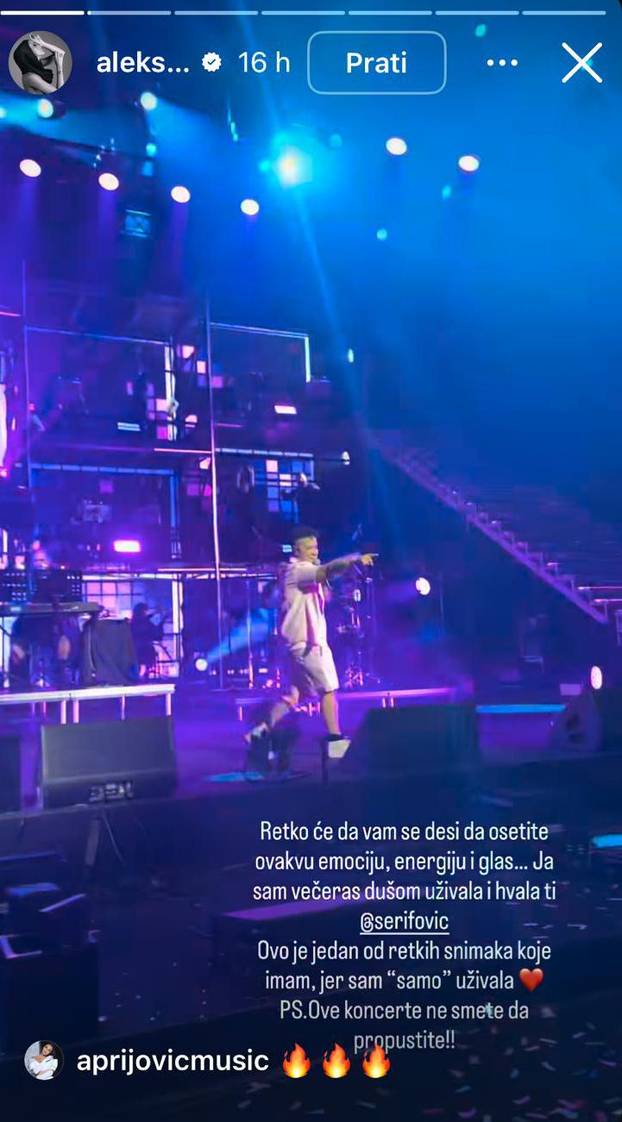 Popularna srpska pop-folk pjevačica Aleksandra Prijović na svojim društvenim mrežama jučer je objavila videa na kojima se vidi kako uživa u koncertima svojih kolega. Video s koncerta Marije Šerifović Aleksandra je objavila uz poruku: "Rijetko će da vam se dogoditi da osjetite ovakvu emociju, energiju i glas… Ja sam večeras dušom uživala i hvala ti Marija".
