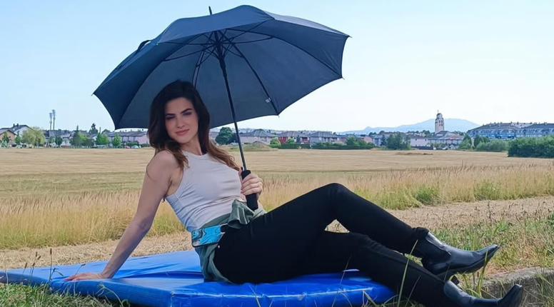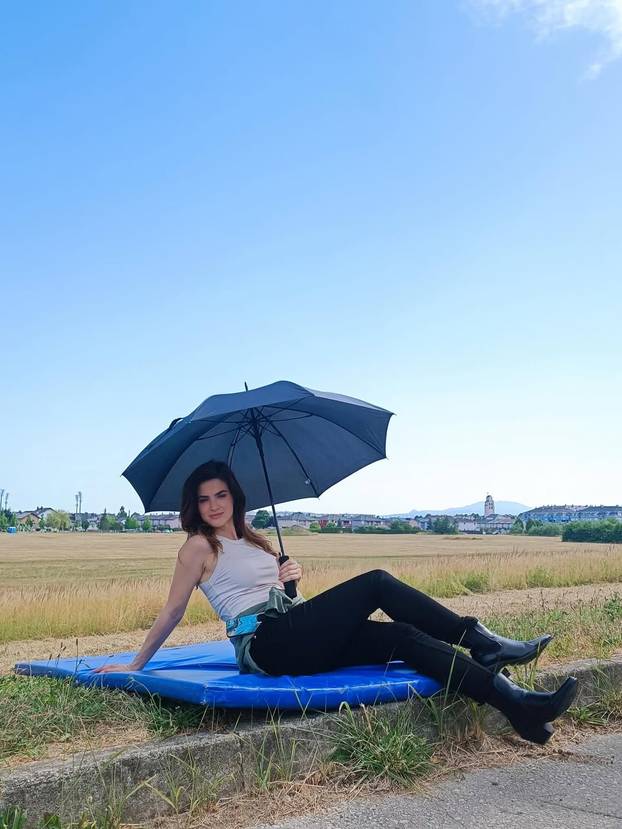 Sjela je na travu, otvorila kišobran i pokušala uloviti barem malo hlada... Jer snimanje na plus 30 nije šala, ali dobre volje očito ne nedostaje!