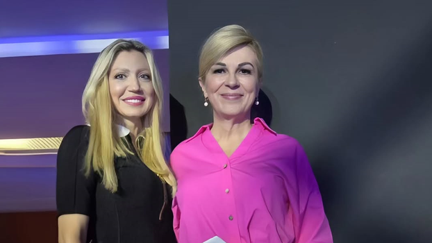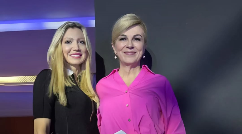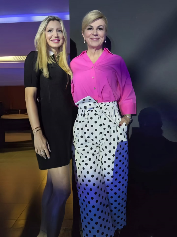 Kolinda je oduševila u bijelim hlačama s točkicama i ružičastom košuljom. Uz nju je stajala Blanka Mateša, koja se odlučila za elegantnu crnu mini haljinu s bijelim ovratnikom.