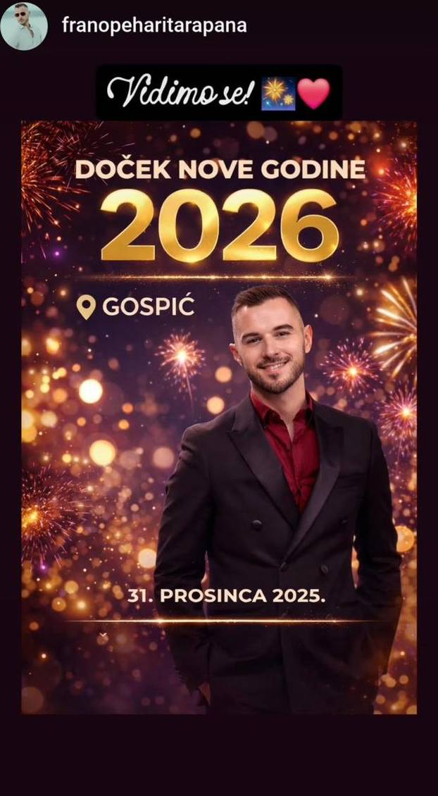 Frano Pehar, jedan od najzapaženijih mladih pjevača domaće glazbene scene, na društvenim je mrežama najavio gdje će provesti najluđu noć u godini. Popularni pjevač najavio je da će doček Nove godine provesti nastupajući s vlastitim bendom ‘Tarapana’ u Gospiću, gdje će pred publikom ispratiti staru i dočekati Novu godinu.
