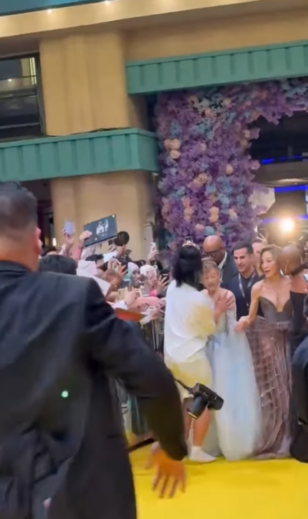 Na videu koji je objavljen na Instagramu vidi se kako Grande hoda držeći za ruku Michelle Yeoh, a uz njih je hodala i Cynthia Erivo. Dok je glumica, koja u popularnom filmu tumači Glindu veselo komunicirala s fanovima i davala im autograme, do nje je dotrčao mladić, obujmio je rukom oko ramena i počeo skakati.