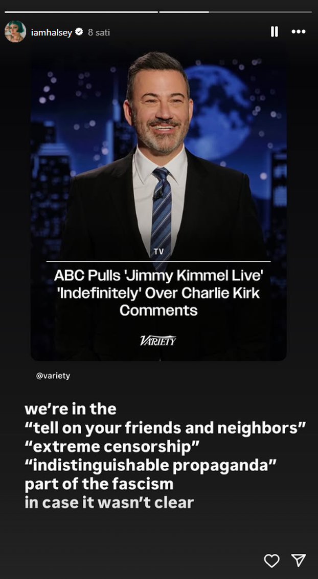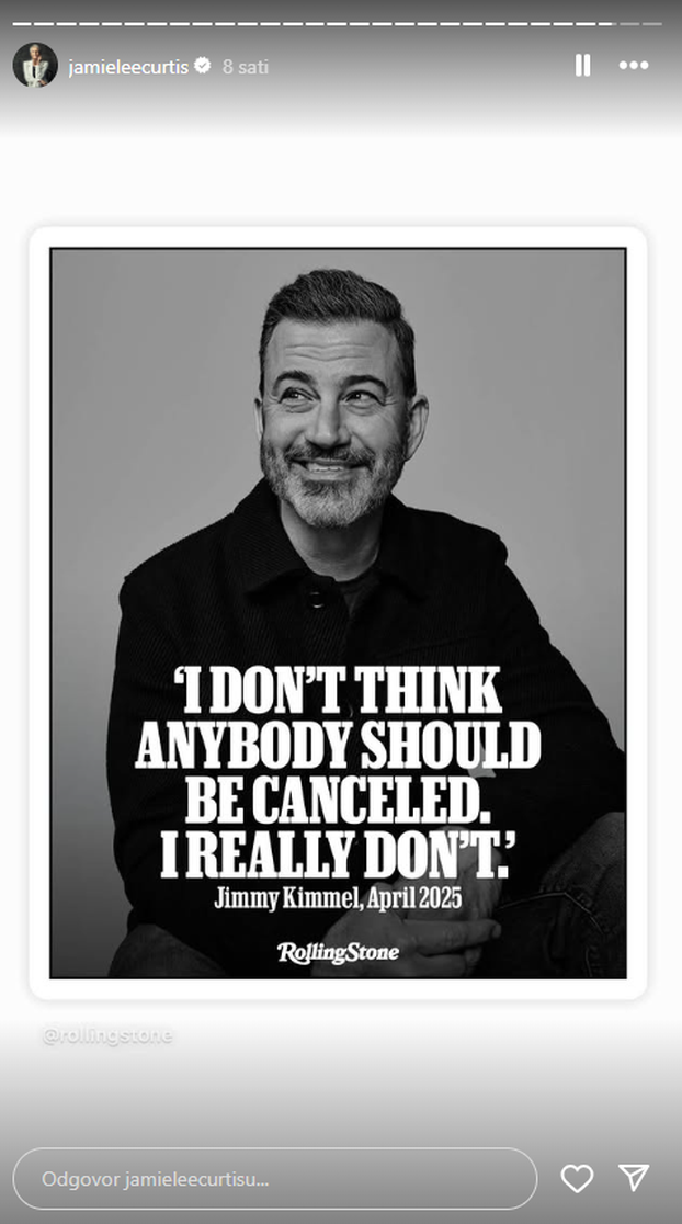 Jamie Lee Curtis je na svojem Instagram storyju podijelila Kimmelovu fotografiju uz poruku da nitko ne bi trebao biti 'otkazan'.