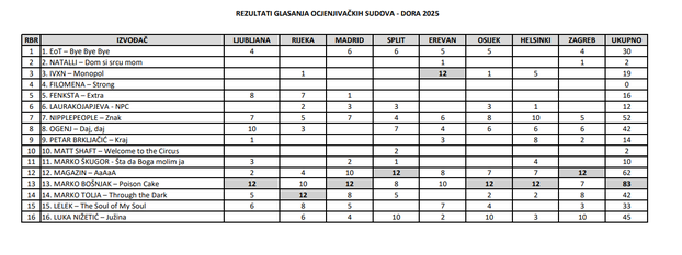 Od domaćih žirija je jedino Osijek dao Bošnjaku 12 bodova, dok je riječki žiri maksimalni broj bodova dao Marku Tolji, a splitski i zagrebački su 12 bodova dali Magazinu.