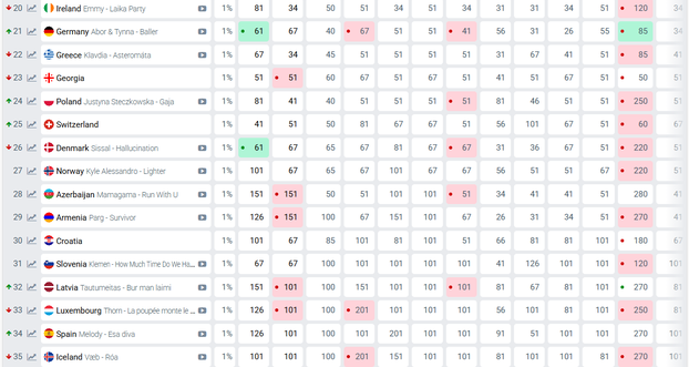 Među top 5 favorita za pobjedu su i Francuska, Finska, Estonija i Nizozemska. Ni naši susjedi ne stoje najbolje na kladionicama. Slovenija je trenutno na 30. mjestu, Srbija na 35., a Crna Gora na 37. mjestu.