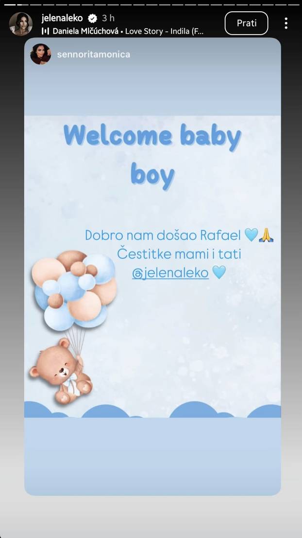 Jelena Leko, poznata influencerica i sestra bivšeg hrvatskog nogometnog reprezentativca Jerka Leke, nedavno je u zagrebačkoj Petrovoj bolnici rodila svoje drugo dijete, sina Rafaela. Na svom Instagramu, gdje je prati 144 tisuća pratitelja, podijelila je nekoliko storija dragih ljudi koji su poželjeli dobrodošlicu prinovi u Jeleninu obitelj.