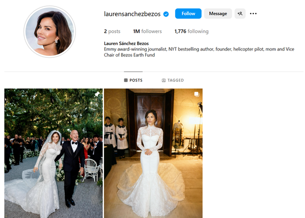 Lauren Sanchez Bezos sve je iznenadila kada je odmah nakon vjenčanja s Jeffom Bezosom sa svog Instagram profila izbrisala sve fotografije, a zatim je objavila dvije nove. Na prvoj fotografiji je Lauren u raskošnoj vjenčanici, a na drugoj se u toj istoj vjenčanici drži za ruku sa svojim novopečenim suprugom Jeffom, vidno sretna među uzvanicima na vjenčanju. Ispod obje fotografiju odmah su počele pristizati čestitke te komentari u kojima se pratitelji dive Laurenoj ljepoti i vjenčanici.